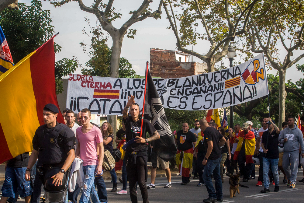 Wie schon im letzten Jahr war auch diesmal das Antifaschistische Infoblatt vor Ort um die Proteste zu begleiten. Am Freitag trafen wir uns in Barcelona-Sants mit einigen Genoss_innen und schnell ging es um die für Sonntag angekündigte neonazistische Demonstration, die antifaschistischen Gegenproteste sowie das geplante Referendum über die Unabhängigkeit Kataloniens vom spanischen Staat. Zu dem Zeitpunkt war noch unklar, ob diese Debatte Auswirkung auf die Mobilisierungsfähigkeit der Neonazis haben könnte. Ganz konkret aber führte ein anderer Vorfall zu angespannter Stimmung mit Blick auf das Wochenende. Am 09.10. sollte in Barcelona ein Prozess gegen zwei Antifaschisten beginnen, die 2011 an den Angriffen gegen Neonazis beteiligt gewesen sein sollen. Vor Gericht gab es eine Kundgebung von etwa 30 Unterstützer_innen, die jedoch von 15 zum Teil behelmten und bewaffneten Neonazis u.a. Mitgliedern der im Stil Autonomer Nationalisten auftretenden Gruppe Casal Tramuntana (CT), von La Falange, der rassistischen Partei Plataforma per Catalunya (PxC) und der neonazistischen Partei Movimiento Social Republicano (MSR) unter „Heil Hitler“-Rufen angegriffen wurde. Die davon überraschten Kundgebungsteilnehmer_innen wurden im Anschluss von eintreffenden PolizistInnen mit Schlagstöcken attackiert und so von den neonazistischen Angreifern getrennt. Einige wenige Personalien wurden aufgenommen, zu Festnahmen kam es nicht.