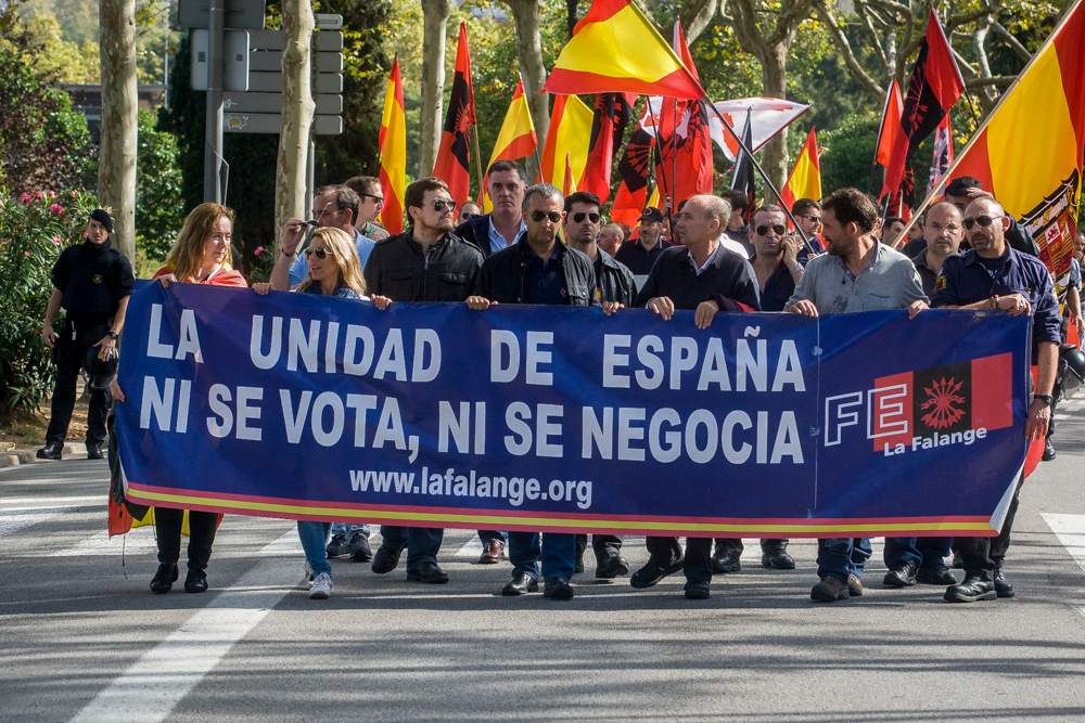 Parallel zur neonazistischen Demonstration gab es auf dem Plaça de Catalunya noch die zentrale Kundgebung zum spanischen Nationalfeiertag und gegen die Unabhängigkeit Kataloniens, an der nach Presseinformationen etwa 35.000 Menschen teilnahmen. Aufgerufen hatte das konservative Bündnis Societat Civil Catalana mit Unterstützung der pro-spanischen Partei Ciutadans, der liberal-konservativen Partei Unión Progreso y Democracia sowie der rechts-konservativen Partido Popular de Catalunya. Und auch hier zeigte die extreme Rechte Präsenz. Am frühen morgen traf sich eine Gruppe von 60 Neonazis am Büro der CT, ging von dort gemeinsam zur Kundgebung und stellte zusammen mit der MSR letztlich einen eigenen Block aus ca. 100 Personen. Ebenfalls vertreten war auch die PxC.