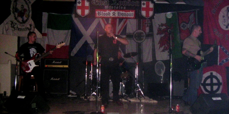 Chemnitzer Neonazis waren in der Blood & Honour Szene stark präsent. Hier mit einem Transparent an der Bühne (links).
