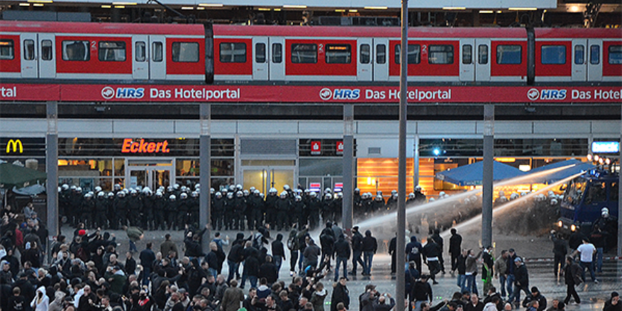 Am Kölner Hauptbahnhof kommt es nach Auflösung der Demonstration zu Auschreitungen zwischen rechten Hooligans und der Polizei
