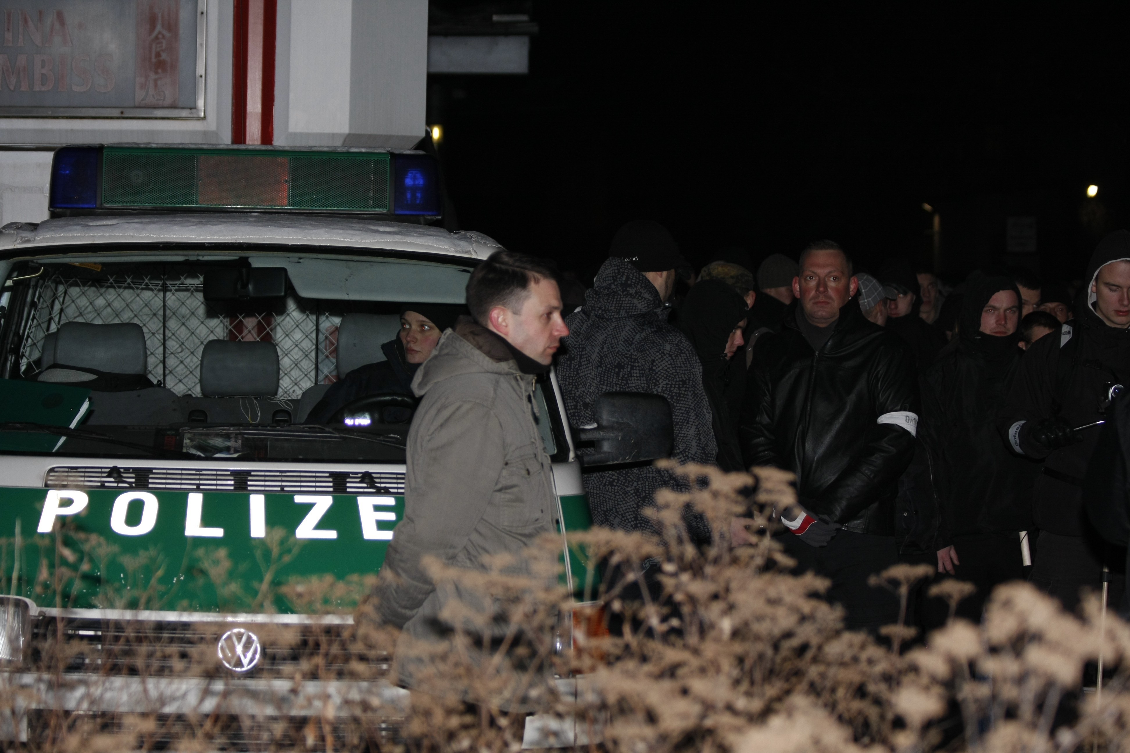 Am Montag war auch Hendrik Lasch erneut zugegen, begleitet von Yves Rhamel, langjähriger Produzent der extrem rechten Musikszene und ehemals offizieller Betreiber des RechtsRock-Labels „PC Records“. Aus der Chemnitzer Neonazi-Szene erschien am Montag David H. Er nahm die letzten Jahre mit anderen Neonazis aus Sachsen nicht nur am extrem rechten „Leistungsmarsch“ in Ungarn teil, sondern fuhr auch regelmäßig zu RechtsRock-Konzerten. Pikant ist, dass H. für die „Distelkam Dienstleistungsgruppe“ arbeitet, die u.a. Leistungen im Sicherheitsdienst anbietet. Einen Auftrag als Wachdienst führte die Firma in einer Geflüchtetenunterkunft in Cottbus aus, wo es in der Neujahrsnacht 2017/2018 zu einem Angriff durch Neonazis kam. Das eingesetzte Sicherheitspersonal hatte die Täter in die Unterkunft gelassen und ihnen den Rückzug frei gehalten. Laut der Intitative „Cottbus schaut hin“ schilderten die Opfer des Angriffs, dass der Wachmann den Neonazis mitteilte „dass sie raus gehen müssen, weil jetzt die Polizei kommt.“