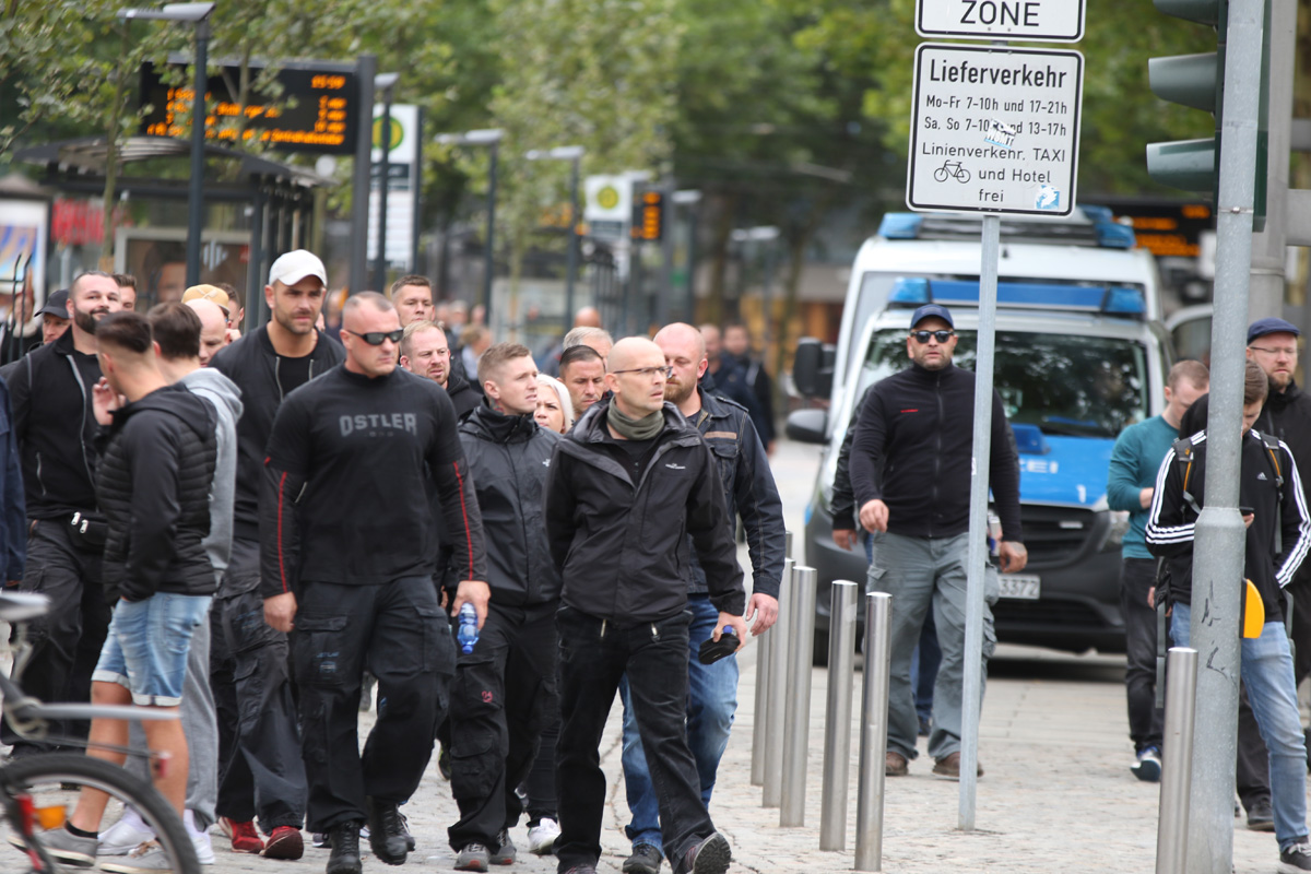 Die Liste der „Prominenz“ der bundesweiten Neonazi-Szene ließe sich sicher mit extrem rechten Multi-Funktionären wie Patrick Schröder, Tommy Frenck oder David Köckert erweitern. Auch könnte man über die Teilnahme von der „Identitären Bewegung“ nahestehenden Akteuren wie Chris Ares Seiten füllen. Informationen zu den offensichtlich bekannten Neonazis ersparen wir uns jedoch an dieser Stelle. Die ausführliche Betrachtung Einzelner im Text soll verdeutlichen, dass die Stimmung am 26. und 27. August unter dem Einfluss erfahrener Personen der extrem rechten Szene stand. Ein gewaltaffines Spektrum, welches seit Jahren rassistische Hetze betreibt und an Angriffen gegenüber Geflüchteten und Migrant_innen beteiligt war.