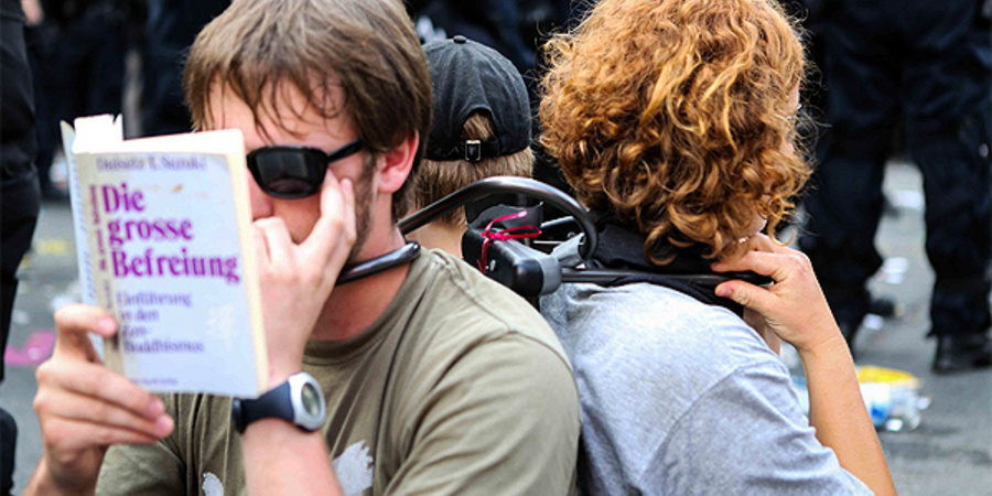 - 1In der Betonpyramide waren mehrere Menschen so fixiert, dass die Polizei sie nicht von der Aufmarschstrecke entfernen konnte.