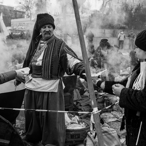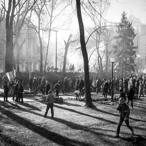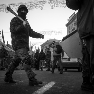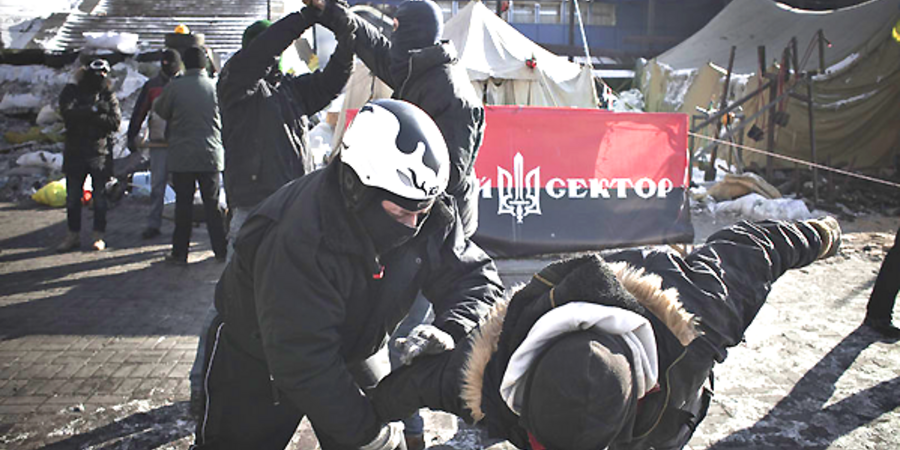 (5 Fotos)Die Gruppierung „Rechter Sektor“, ein sich erst im Laufe der Proteste herausbildendes Sammelbecken für verschiedene nationalistische und faschistische Organisationen, trat besonders bei militanten Auseinandersetzungen und als Teil der Verteidigungsstrukturen des Majdan in Erscheinung. Die Rot-Schwarze Fahne des „Rechten Sektors“ ist inzwischen bei allen Protesten massenhaft zu sehen. Die Rekrutierung neuer Mitglieder hat weiter unvermittelt Zulauf, vor allem junge Männer eifern darum, in die gut organisiert auftretende Struktur aufgenommen zu werden.