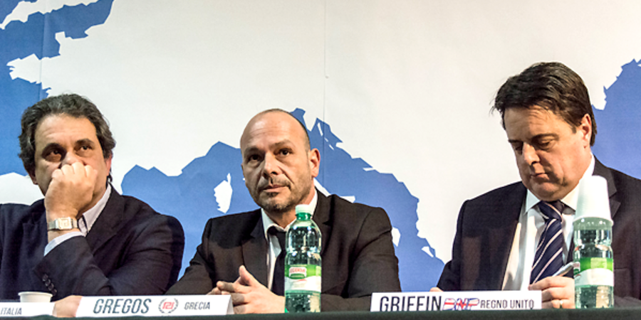 V.l.n.r: Die Neonazi-Politker Roberto Fiore (Forza Nuova/Italien), Antonis Gregos (Chrysi Avgi/Griechenland) und Nick Griffin (BNP/England) bei dem Neonazi-Kongress „Europa erwacht““ am 1. März 2014 in Rom.