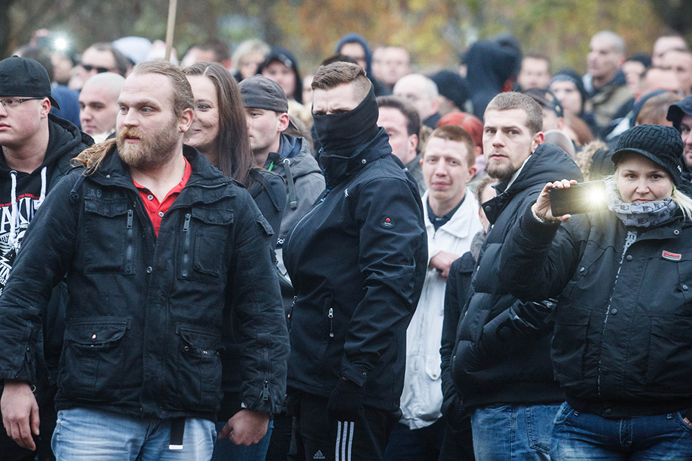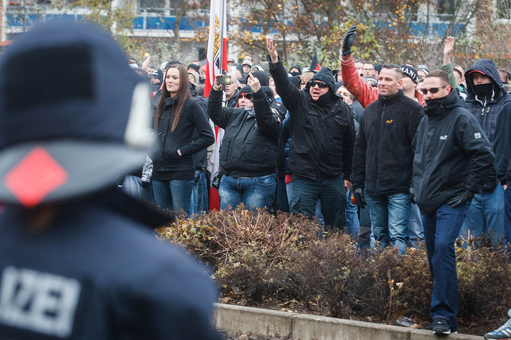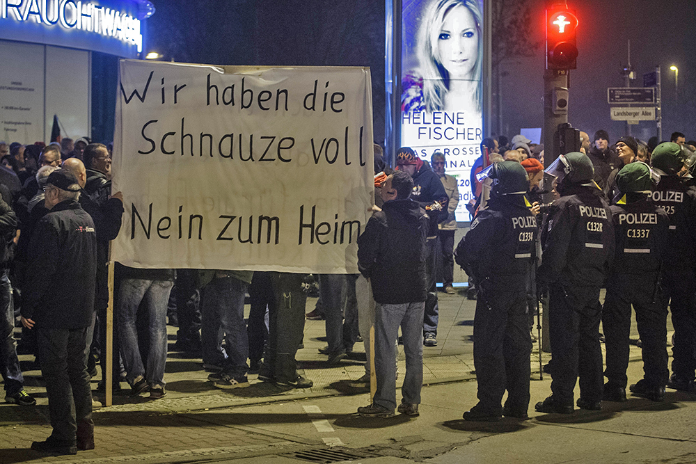 Doch nicht nur in Berlin, sondern auch in anderen Städten etabliert sich derzeit eine Mischszene aus bisher nicht organisierten BürgerInnen, rechten Hooligans und organisierten Neonazis unter dem Label „Montagsdemo“ mit stetig wachsenden TeilnehmerInnenzahlen. Die in Dresden seit mehreren Wochen durchgeführten Montagsdemos unter dem Label „Pegida“ (Patriotische Europäer gegen die Islamisierung des Abendlandes) konnten am letzten Novembermontag etwa 5.500 Personen mobilisieren. Im Gegensatz zu HoGeSa versuchen sich die InitiatorInnen einen bürgerlichen Anstrich zu geben, scheinbar mit Erfolg: Der sächsische Innenminister Ulbig zeigte Verständnis für Pegida und kündigte an, spezielle Polizeieinheiten für „straffällige Asylbewerber“ gründen zu wollen. Inzwischen haben sich bundesweit verschiedenste Facebookgruppen unter ähnlichen Labels wie Bagida, Dügida und Legida formiert.