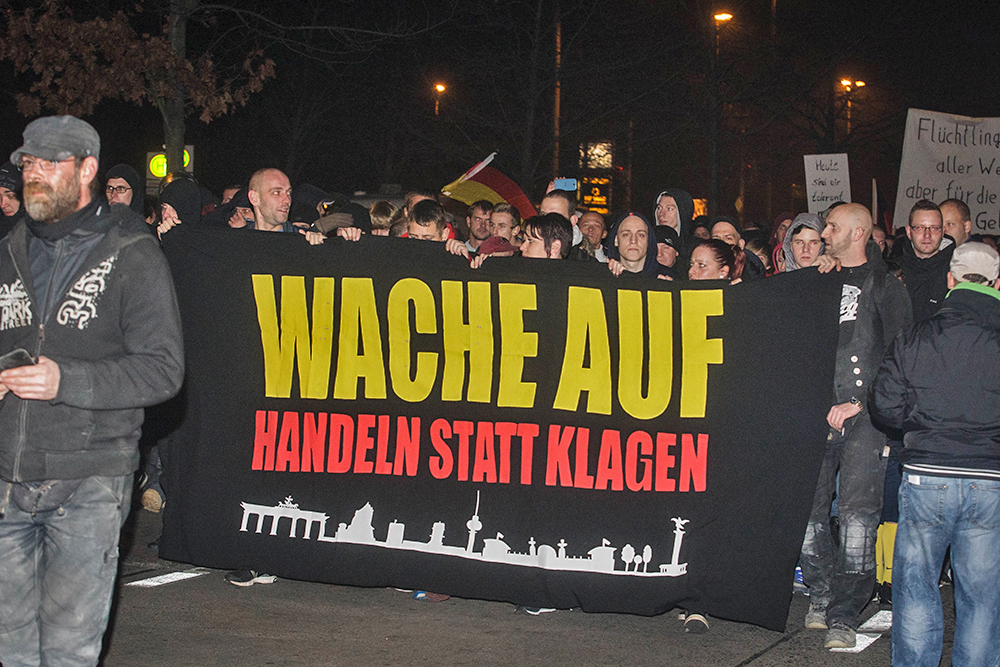 Nach den Erfolgen mit der Agitation über offene Webplattformen gegen eine geplante Geflüchtetenunterkunft im Stadtteil Hellersdorf im Sommer 2013 warteten die Neonazis ungeduldig auf den Anlass für ihren nächsten Coup. Die Eröffnung einer entsprechenden Seite auf Facebook erfolgte unmittelbar, nachdem der Berliner Senat Ende Oktober 2014 seine Pläne für die Einrichtung mehrerer Containerlager, unter anderem in den Ortsteilen Marzahn, Buch und Köpenick, ankündigt hatte. Die inhaltlich und praktisch an das Format der „Bürgerbewegung Hellersdorf“ angegliederte Seite erschließt somit ein neues, sich betroffen wähnendes Klientel. Den anfänglichen Aufruf einer davon unabhängig agierenden Bürgerinitiative zu einer Montagsdemo am 3. November unterstützten die Neonazis auf ihren etablierten Seiten und über interne Verteiler. Der Aufzug wurde daraufhin wegen inhaltlicher Differenzen und Sicherheitsbedenken vom Anmelder abgesagt, was die Neonazis, offenbar mit Wohlwollen der Polizei, geschickt ausnutzten. Zum Startzeitpunkt ließ die Polizei eine angeblich spontane Demonstrationsanmeldung durch Uwe Dreisch (Die Rechte) zu, so dass etwa 150 bis 200 Personen mit rassistischen und nationalsozialistischen Parolen durch Marzahn zogen. Neu in Berlin waren jedoch die „Ahu“-Rufe aus dem rechten Hooligan-Milieu.