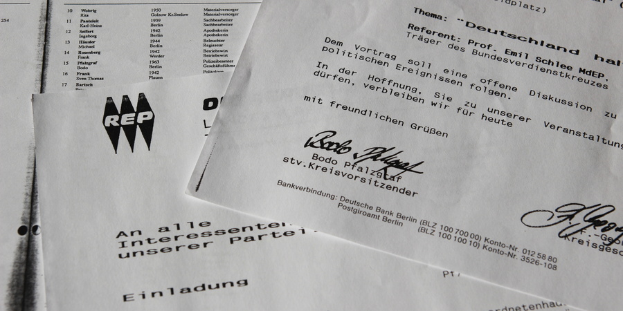 - 6So lud er im Januar 1991 zur Gründungsversammlungen des REP-“Kreisverbandes Mitte, Friedrichshain, Prenzlauer Berg“ und des REP-Kreisverbandes „Pankow, Weißensee, Hohenschönhausen“ ein