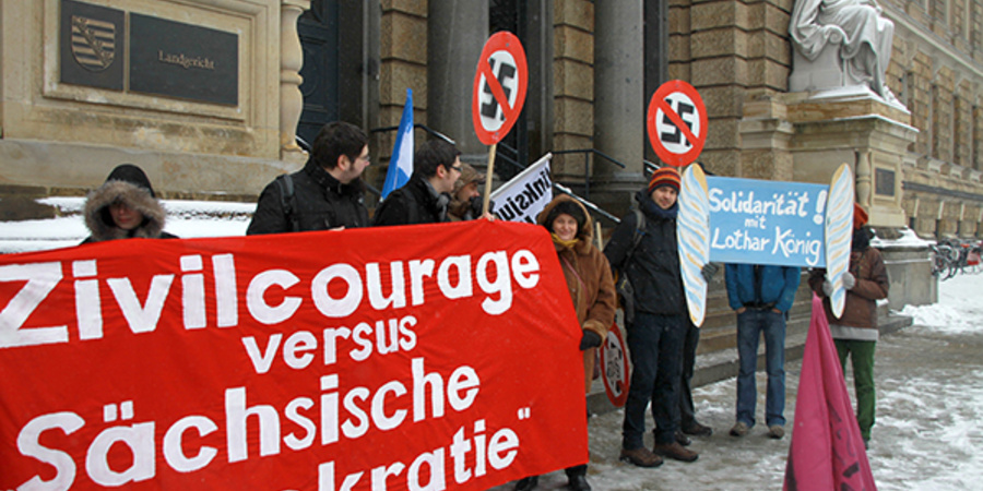 Im August 2011 durchsuchte die sächsische Polizei die Amts- und Wohnräume des Pfarrers Lothar König in der Jungen Gemeinde Jena und beschlagnahmte unter anderem deren Lautsprecherwagen. Die Staatsanwaltschaft Jena warf dem Pfarrer, der sich schon in den 1990er Jahren gegen die späteren Mitglieder des NSU engagiert hatte, u. a. aufwieglerischen Landfriedensbruch am 19. Februar 2011 vor. Weitere Verfahren der sächsischen Justiz folgten, u. a. gegen Tim H. und den Geschäftsführer der Berliner Vereinigung der Verfolgten des Naziregimes – Bund der AntifaschistInnen (VVN-BdA), Markus Tervooren, denen jeweils Landfriedensbruch vorgeworfen wurde. Die Liste ließe sich lange fortsetzen.