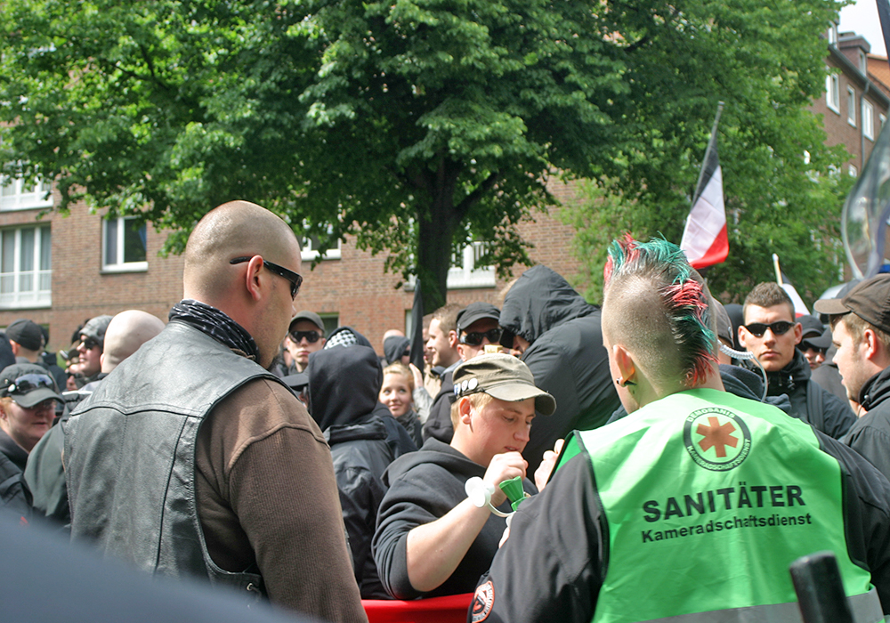 Wo Neonazis derzeit eine größere Straßenpolitik betreiben können, liegt diese quer zu den Grundannahmen der „autonomen“ Politik. Bei PEGIDA-Demonstrationen oder rassistischen Protesten gegen die Einrichtung von Flüchtlingsunterkünften mischen Neonazis mal am Rande, mal maßgeblich mit. Dieser neue Zugang zu Bevölkerungsschichten, die sonst von neonazistischer Politik entfernt standen, ist eine der wenigen Freuden, die Neonazis dieser Tage haben — und steht dem alten AN-Befund, dass das hoffnungslos umerzogene „Volk“ höchstens Kulisse für aber nicht Träger oppositioneller Politik sein könne, entgegen. Zudem ist den AN das Bedürfnis zu eigen, die Treue zum Nationalsozialismus offen und öffentlich zu zelebrieren — vermummt wird das Gesicht, nicht aber die Ideologie. Bei den jetzigen rassistischen Protesten verhält es sich umgekehrt. Die rechten Straßenproteste brauchen einen bürgerlichen Charakter oder zumindest eine zivile Fassade — die teilnehmenden Neonazis vermummen ihre Ideologie und nicht ihr Gesicht. Randale-Episoden wie die Ausschreitungen bei „LEGIDA“ in Leipzig, wo Hooligans und organsierte Neonazis aus dem Spektrum der „Freien Kräfte“ vereint gegen Presseleute und Gegenproteste anstürmten, kehren diesen Trend nicht um, sondern bleiben einzelne Streicheleinheiten für die Neonazi-Seele.