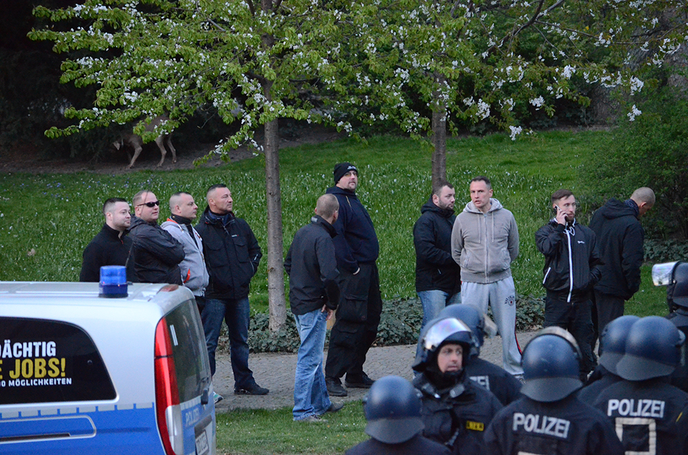 In den vergangenen Jahren haben entsprechende Gruppierungen mit braunem Spielbein wie die „Blue Caps LE“ oder auch „Scenario“ den aktionistischen Bereich der Szene zunehmend dominiert, im gleichen Maß sank auch die Bindung an den Aktionsort Stadion. Bereits bei den Schneeberger „Lichtelläufen“ Ende 2013 zeigte sich, dass ein fußballaffines Spektrum in Sachsen verstärkt unter politischem Vorzeichen auf die Straße drängt. Wie groß die Nachfrage tatsächlich ist, machte HoGeSa klar. In einem internen Kommunikationsforum debattierten kurz vor der Eskalation in Köln mehrere hundert ostdeutsche UnterstützerInnen über neue Aktionen. Viele gaben sich als „Sportfreunde“ von Lok Leipzig zu erkennen.
