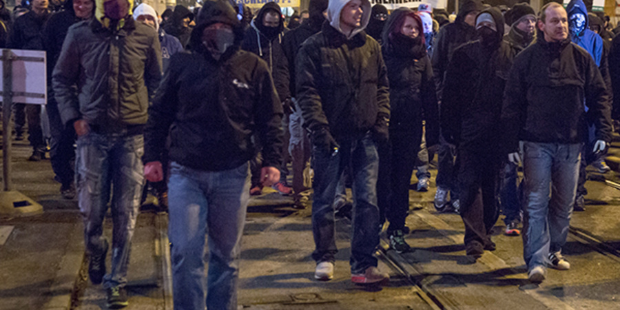 Aber dann kam, wie gesagt, LEGIDA. „Für jeden sollte Teilnahme Pflicht sein“, hieß es kurz vor dem ersten Marsch am 12. Januar in einem Aufruf, der in der Fanszene kursierte und zu einem eigenen Vorabtreffpunkt in der City mobilisieren sollte. Dort erschienen dann mehr Leute, als „Scenario“ je vereinte — bis zu 300 sollen es gewesen sein. Anstelle von Vereinsfarben wurden vielfach HoGeSa-Klamotten aufgetragen. Die Polizei ließ das unangemeldete Treffen gewähren. Bei der zweiten Gelegenheit wurde die lange Leine zum Nachteil der geschmähten „Lügenpresse“ ausgenutzt. Und beim dritten LEGIDA-Marsch am 30. Januar stellten die Hooligans durch Unterstützung (etwa aus Dresden und Halle) bereits knapp ein Viertel der 1.500 Teilnehmenden. Die rechte Fan- und die von ihr kaum trennbare örtliche Neonaziszene rissen eine Schwungmasse mit, die man nach Jahren der Stagnation schon abgeschrieben glaubte. Unverhofft sind „die Hools“ wieder ein Faktor geworden.