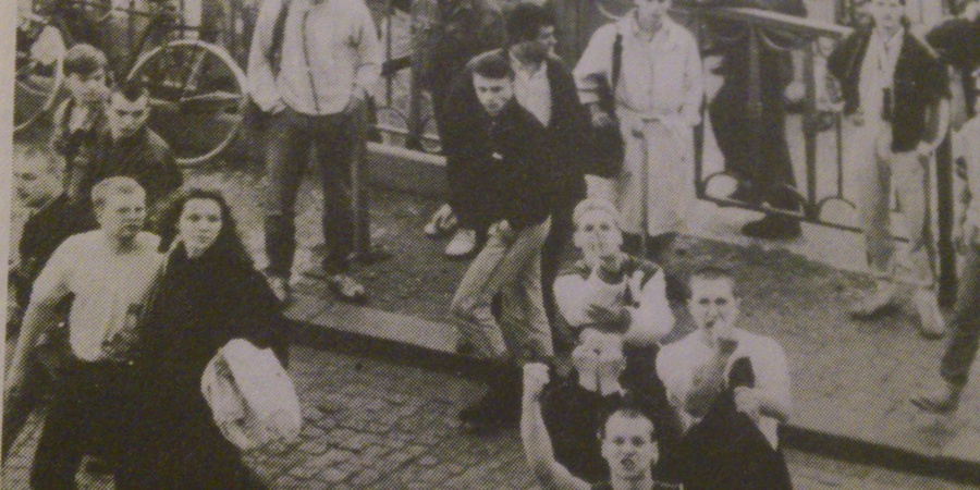 Neonazi-Angriff auf ein besetztes Haus in Prenzlauer Berg am 17. März 1990. Mit dabei der West-Berliner NF-Aktivist Christian F. (vorne links).