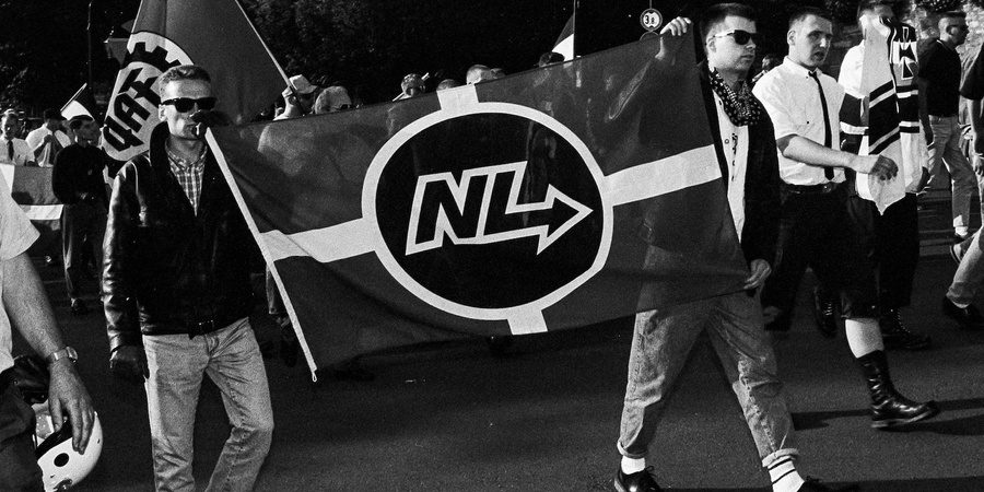 Anhänger der Hamburger Neonazi-Gruppe "Nationale Liste" (NL) beim "Rudolf Heß Gedenkmarsch" 1993 in Fulda.