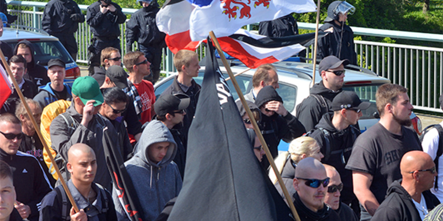 Die rassistischen Brandstifter Thomas Hocke (links mit Sonnenbrille) und Florian Hillner (mitte mit grauer Kapuze) bei einer NPD-Demonstration am 1. Mai 2014 in Rostock.