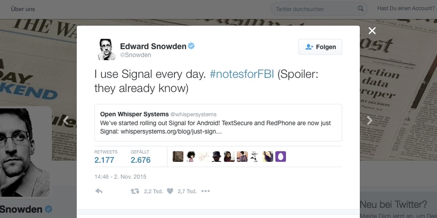 Edward Snowden spricht Signal eine Empfehlung aus.