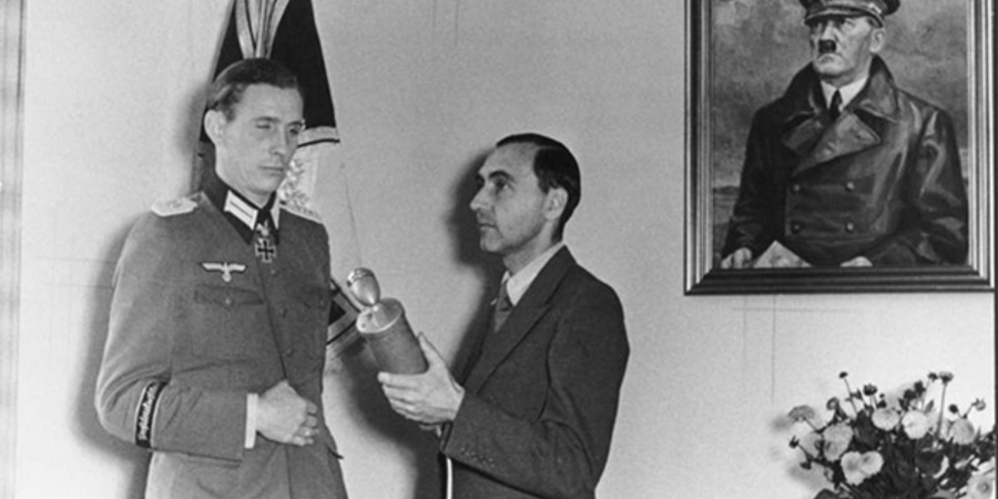 Der Major Otto Ernst Remer war ein Kommandeur des Wachbataillons Berlin, der den Putschversuch der Offiziere [am 20.7.1944] vereitelte. Hier im Zeitspiegelgespräch mit Paul Cnuva, dem Leiter der Gruppe Zeitgeschehen des Großdeutschen Rundfunks. Remer war in der Nachkriegs-BRD Mitbegründer und 2. Vorsitzender der neonazistischen Sozialistischen Reichspartei (SRP).