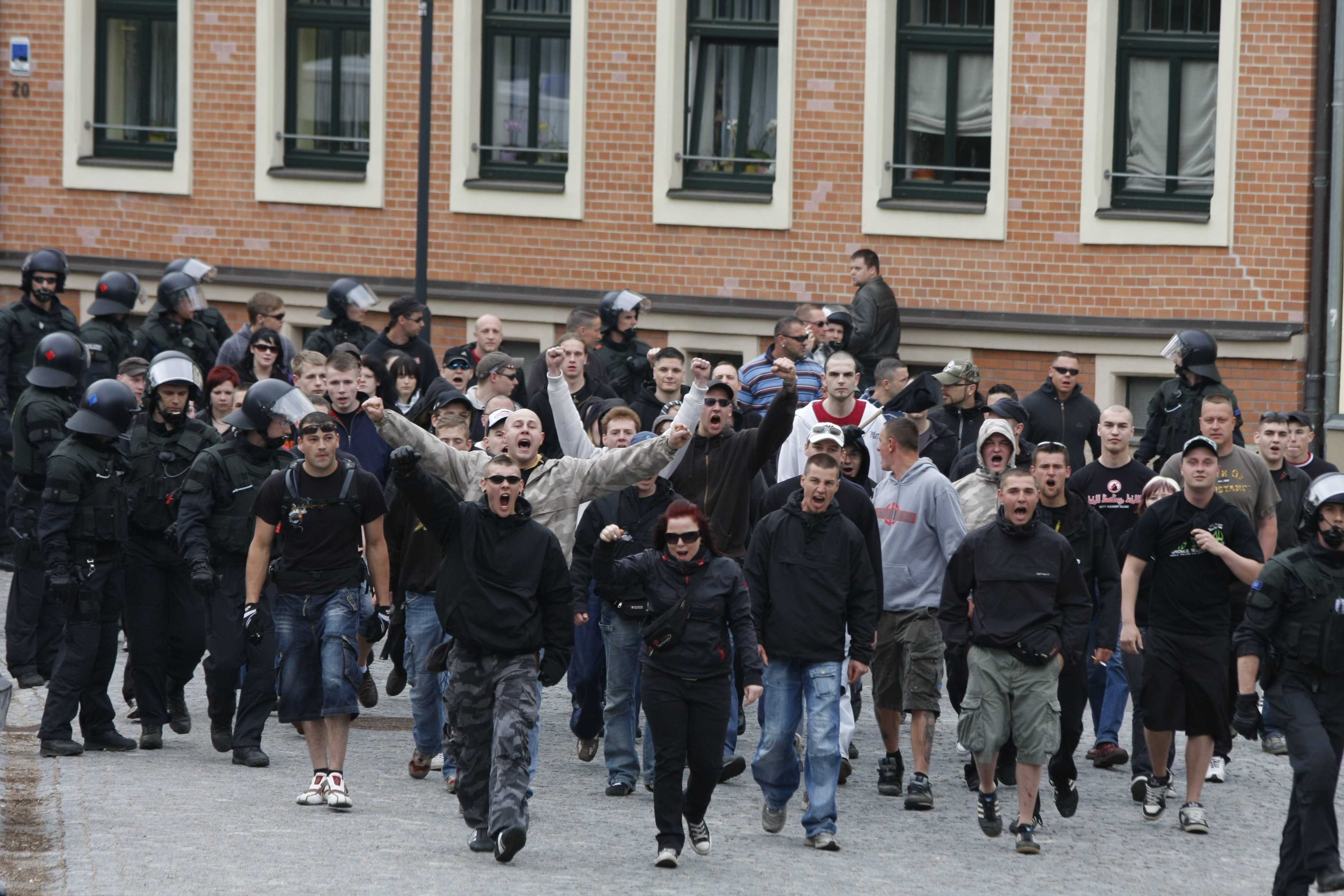 Tony Gerber (weißes Hemd) als Ordner auf einem von NPD und "Nationalen Sozialisten Zwickau" organisierten Aufmarsch am 1. Mai 2010 in Zwickau. Der frühere Bekannte von André Eminger ist heute ein regionaler Leiter der "Identitären Bewegung" in Sachsen.