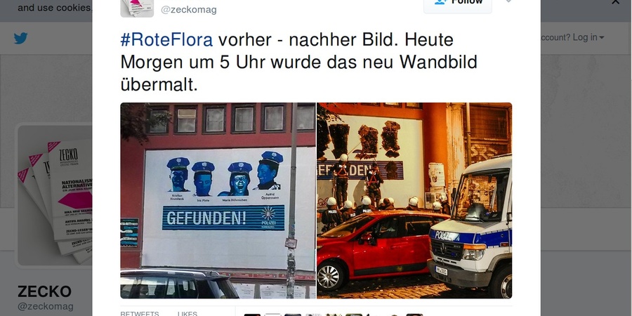 Gegen den rechtswidrigen Einsatz von verdeckten ErmittlerInnen richtete sich ein Plakat an der Roten Flora in Hamburg bis es von Polizeikräften unkenntlich gemacht wurde.