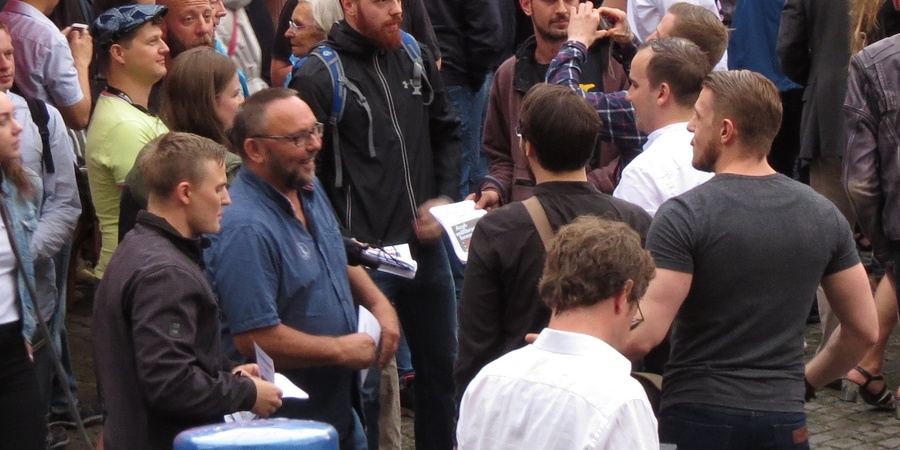 Bei der Aktion beobachteten anwesenden Antifaschist_innen wie Robert Teske im Außenbereich eines Lokals an der Schlachte saß — ein merkwürdiger Zufall? Wohl kaum, bei der IB-Demonstration am 17. Juni 2017 in Berlin nahmen neben zahlreichen Identitären aus Bremen auch Robert Teske und Marvin Mergard teil. Einer der bisherigen Höhepunkte der „nicht“ stattfindenden Zusammenarbeit zwischen AfD/JA und IB war eine Protestaktion der IB während eines Wahlkampfauftrittes von Angela Merkel (CDU) auf dem Bremer Marktplatz am 15. August 2017, bei der die IB Flyer verteilte. Fotos belegen, wie Magnitz, Mergard und Teske sich vertraut und angeregt mit AktivistInnen der IB unterhalten. In einem daraufhin erschienenen Artikel im Weser-Kurier äußerte sich der Bundestagskandidat folgend dazu: „(…) ich ignoriere keine Leute, die ich kenne“10 .