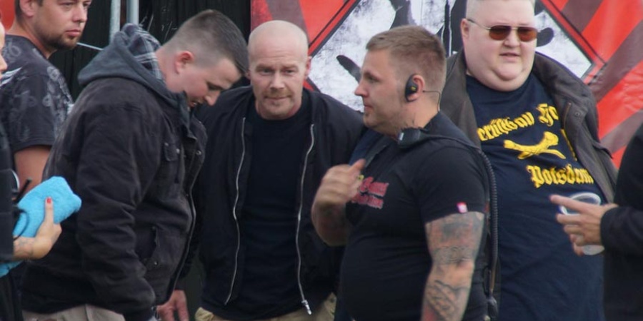 1.v.r. Uwe Menzel als Sänger der RechtsRock-Band „Uwocaust“ auf dem „Rock gegen Überfremdung“ im Juli 2017 in Themar.