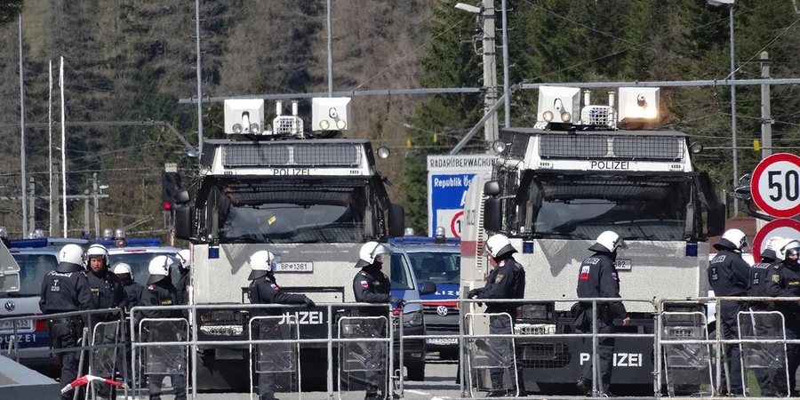 Willkommen in Österreich. Wasserwerfer der österrreichischen Polizei 300 Meter nach der Brenner-Grenze während einer antirassistischen Demo im April 2016.