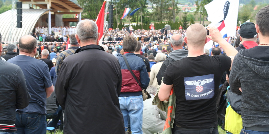 Bleiburg 2017: Blick auf die Messe. Ein Besucher mit einem T-Shirt mit dem Slogan "Za dom spremni" ("Für die Heimat bereit"), einem faschistischer Gruß der Ustascha. Das Symbol ist eine Mischung aus deutschem Reichsadler und dem Wappen des faschistischen NDH-Staates.