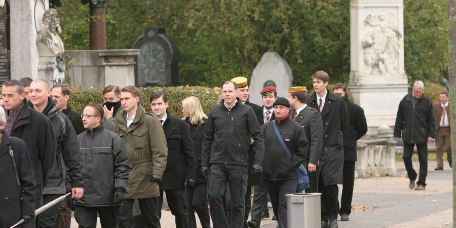 Herwig Götschober (rote Kappe) zusammen mit Martin Sellner (Bildmitte) im Neonazi-Pulk auf dem Weg zum Grab eines Nazi-Idols, Wien 2009.