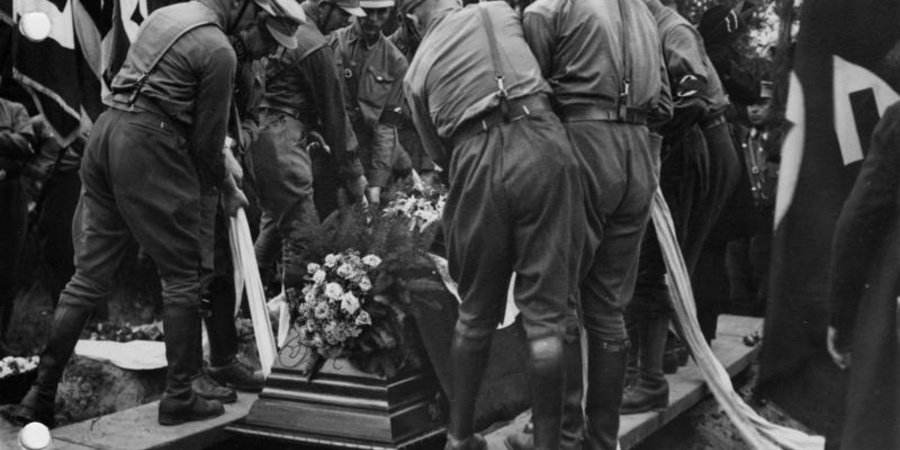 Die inszenierte Beisetzung eines in Berlin ermordeten SA-Mannes in Eberswalde.
