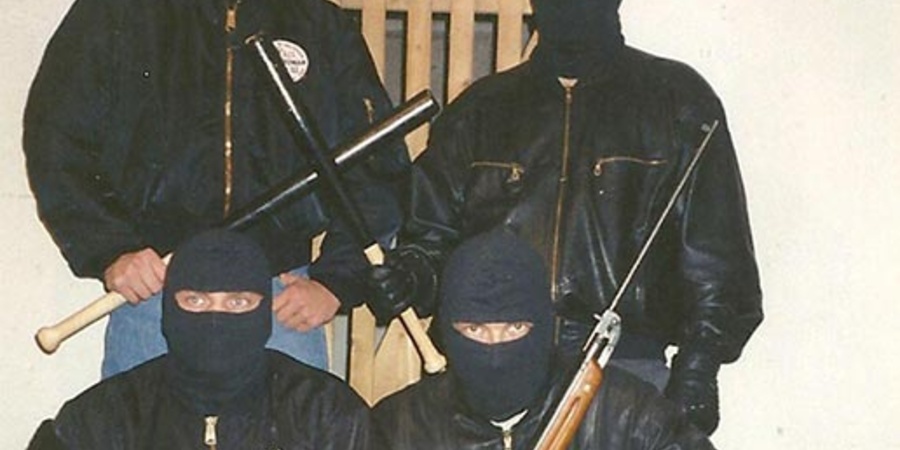 Die Vertrauten des NSU Jan Botho Werner und Polizeiinformant Thomas Starke posieren Ende der 1990er Jahre mit weiteren bewaffneten Neonazis.