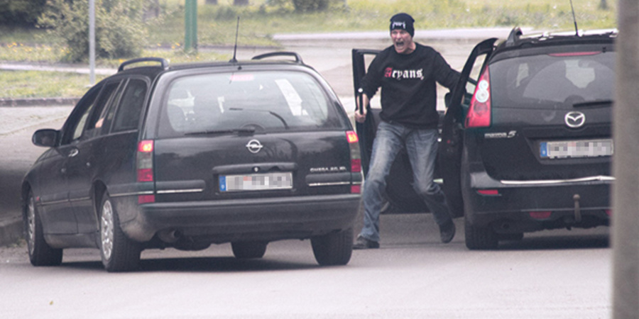 Carsten M. stürmt am 1. Mai 2017 in Halle mit einem Schlagwerkzeug aus dem Wagen.