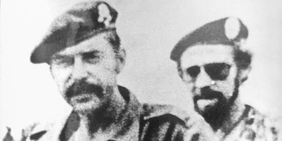 Bolivien, 1980er Jahre: Stefano Delle Chiaie (hinten, mit dunkler Brille) und der neonazistische deutsche Söldner Joachim F. (ehemaliger spanischer Fremdenlegionär) in der Uniform von „Los Novios de la Muerte“ („Die Verbündeten des Todes“). Das paramilitärische „Todesschwadron“ wurde von dem NS-Kriegsverbrecher Klaus Barbie in Zusammenarbeit mit dem lokalen „narcotraficante“ Roberto Suarez gegründet.