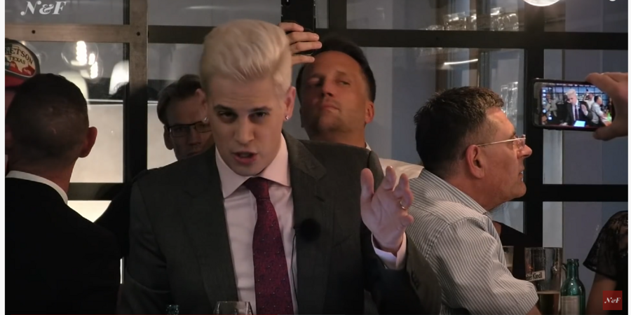 Milo Yiannopoulos aus der Gamergate Bewegung, hier bei einem Besuch in Berlin zur AfD-Medienkonferenz im Mai 2019, wurde 2015 Leiter der „Breitbart Tech“ Abteilung, um Breitbart zu „DER Plattform für die Alt-Right” zu machen.