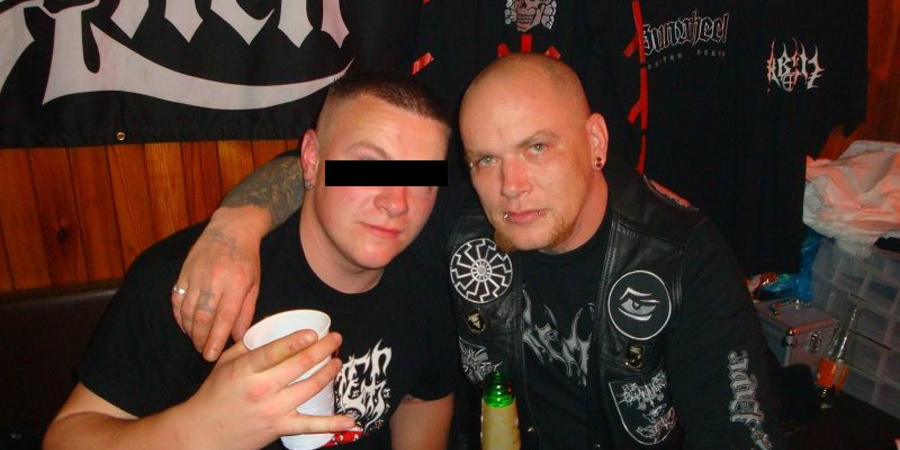 Christian Schöndorfer (rechts), Geschäftspartner von Hendrik Möbus, am Verkaufsstand von „Merchant of Death/Darker Than Black“ vor wenigen Jahren. Im Hintergrund ein T-Shirt mit dem Symbol der SS-Division „Totenkopf“.