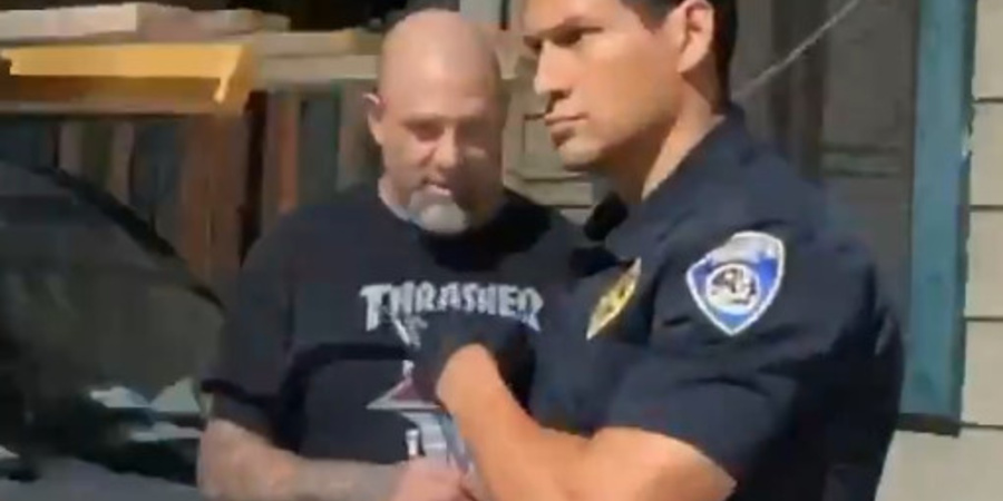 Der BLM-Demonstrant Robert Forbes starb durch den Neonazi Timothy Kieth Moore (links), der nach der Tat ohne Handschellen mit Zigarette am Polizeiwagen gelehnt fotografiert wurde.