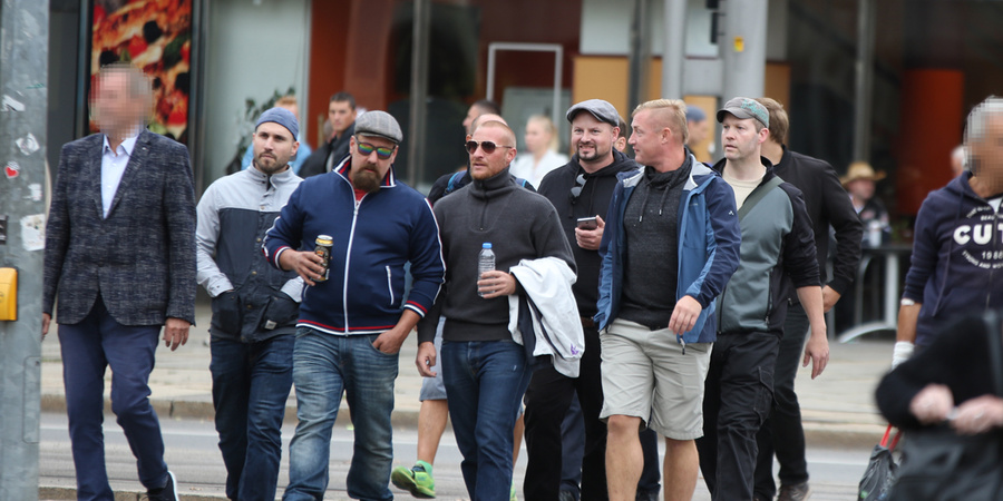 Stephan Ernst (rechts) und Markus Hartmann (3.v. rechts) am 1. September 2018 bei der Anreise zu einem AfD-Aufmarsch in Chemnitz.