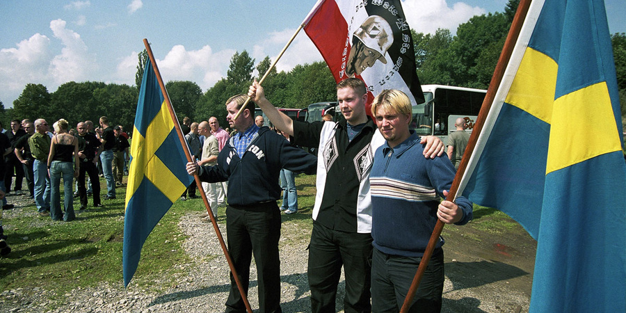 Am 17. August 2002 posierte Stephan Ernst (mittig) mit schwedischen Neonazis beim neonazistischen „Rudolf Heß-Gedenkmarsch“ in Wunsiedel.