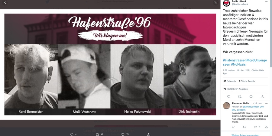 Weil ein Parlamentarischer Untersuchungsausschuss ein geeignetes Mittel sein kann, um die Vorgänge in Lübeck seit dem Brand im Januar 1996 aufzuarbeiten, hat unsere Initiative zum 25. Jahrestag die Online Petition #HafenstraßenMordUnvergessen ins Leben gerufen, mit der wir den Landtag von Schleswig-Holstein zur Einrichtung eines Untersuchungsausschusses auffordern.3 Wir sind der festen Überzeugung, dass eine Neubewertung der Erkenntnisse keine andere Schlussfolgerung zulässt, als die strafrechtlichen Ermittlungen wiederaufzunehmen und in einem neuen Strafprozess darüber zu entscheiden, ob die vier Neonazis aus Grevesmühlen für den zehnfachen Mord von Lübeck zur Verantwortung gezogen werden können.