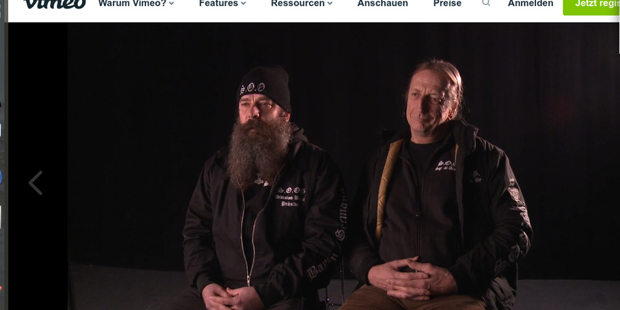 Giuseppe Inguaggito, Präsident der SoOG Division Bayern, (links) und der Angeklagte Frank Holl, Sergeant at Arms der SoOG Division Bayern, (rechts) beim Interview mit "Patrioten-TV".
