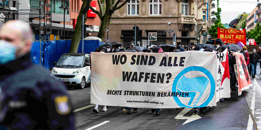 Kampagnenauftakt war eine Demonstration in der Stadt Offenbach, der Homezone Franco Albrechts. Eine Woche vor dem ersten Prozesstag zogen etwa 500 Demonstrierende durch die Innenstadt. Erster Zwischenstopp war die Kneipe "Antia‘s Pilsstube". Dort waren Besucher*innen im Dezember 2018 angegriffen worden, nachdem sie gegen die rassistischen Parolen rechter Fußballfans interveniert hatten. Unter den Angreifern soll sich auch ein Polizeianwärter befunden haben. In einem Redebeitrag wurde der Fall thematisiert und Solidarität mit den Betroffenen ausgedrückt. Auf der Zwischenkundgebung vor dem Polizeipräsidium am Ledermuseum berichtete die Initiative „19. Februar Hanau“ über rassistische Polizeiermittlungen und das Verhalten rechter SEK-Beamter in der Tatnacht des rassistischen Terroranschlags in Hanau. Anschließend zog die Demonstration in das Offenbacher Nordend. Am Wohnort von Franco Albrecht wurde ein Transparentwechsel vollzogen, und der Slogan „Wo sind all die Waffen?“ durch den Hinweis auf den dortigen Waffenfundort ersetzt. Hier hatte Albrecht aus Beständen der Bundeswehr entwendete Waffen und Munition gehortet. Mit Flyern und Sprechchören wurde die Nachbarschaft darüber informiert. Am Endpunkt der Demonstration vor dem Offenbacher Rathaus sprach die Initiative „NSU Watch“, die den Prozess seit seinem Beginn begleitet und die Protokolle der Verhandlungstage auf ihrer Homepage einer breiten Öffentlichkeit zugänglich macht.
