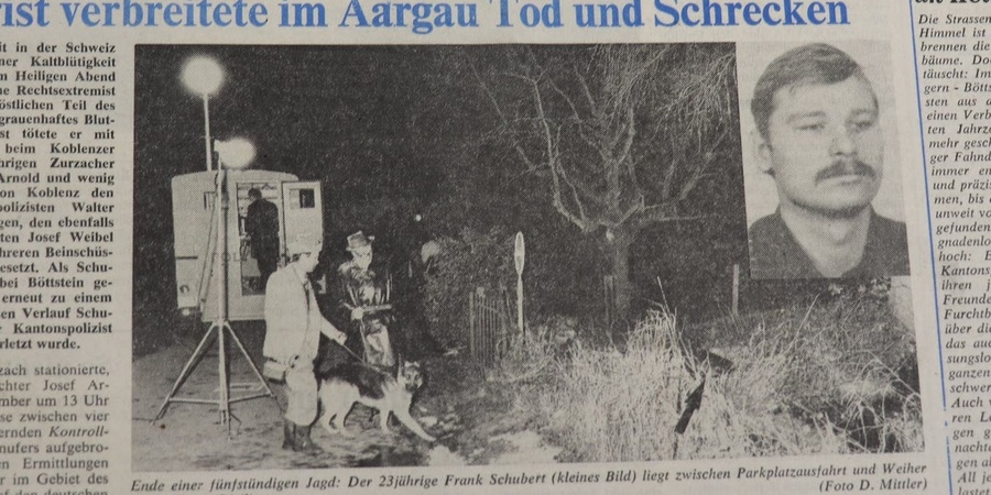 Andreas Förster1980 ist als das „braunes Terrorjahr“ in die Geschichte der Bundesrepublik eingegangen: Von Januar bis Mitte Dezember waren bei rechtsterroristischen Anschlägen - darunter dem Oktoberfestattentat von München - 18 Menschen ums Leben gekommen, Hunderte wurden zum Teil schwer verletzt. Für die Todesopfer 19 und 20 sorgte am 24. Dezember 1980 der deutsche Neonazi Frank Schubert. Bei einem missglückten Waffenschmuggel erschoss er an der Grenze zu Deutschland die Schweizer Polizeibeamten Josef Arnold und Walter Wehrli, bevor er sich nach einem Feuergefecht mit der Polizei selbst richtete.