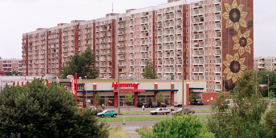 Das sogenannte Sonnenblumenhaus in Rostock-Lichtenhagen. Im August 1992 wurde das Wohnheim für vietnamesische Vertragsarbeiter*innen tagelang von einem rassistischen Mob belagert und angegriffen.