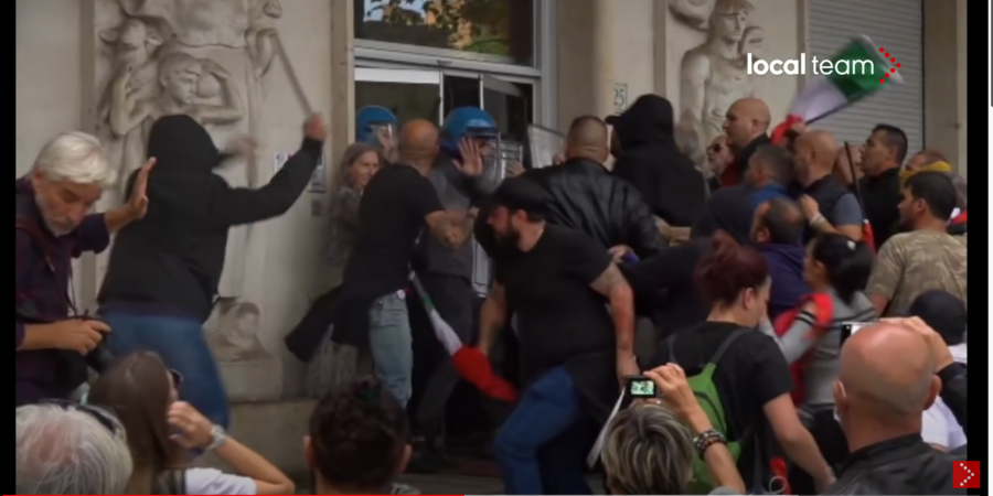 Am 9. Oktober 2021 marschierten tausende Maßnahmen-Gegner_innen durch das römische Zentrum. Angeführt wurden sie von der neofaschistischen "Forza Nuova". Diese machte keinen Hehl aus ihrer politischen Gesinnung und posierte immer wieder mit ausgestrecktem rechtem Arm für die Kameras. Der Zug endete mit einem Sturm auf das Hauptquartier der CGIL, bei dem die Büros des Gewerkschaftsbundes demoliert wurden. Im Nachgang saßen mehrere Neofaschisten in Haft oder standen unter Hausarrest und das Parlament debattiert über ein Verbot der Partei.