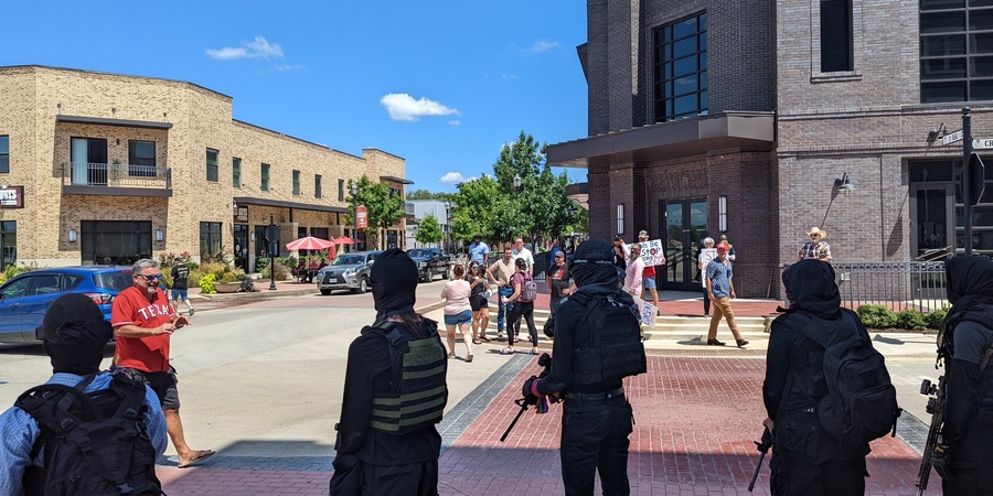 Der "John Brown Gun Club" (Elm Fork) beschützt am 28. August 2022 in Roanoke (Texas) ein "Queer Brunch", vor neonazistischen "Proud Boys" die eine gewaltsame Verhinderung angekündigt hatten.