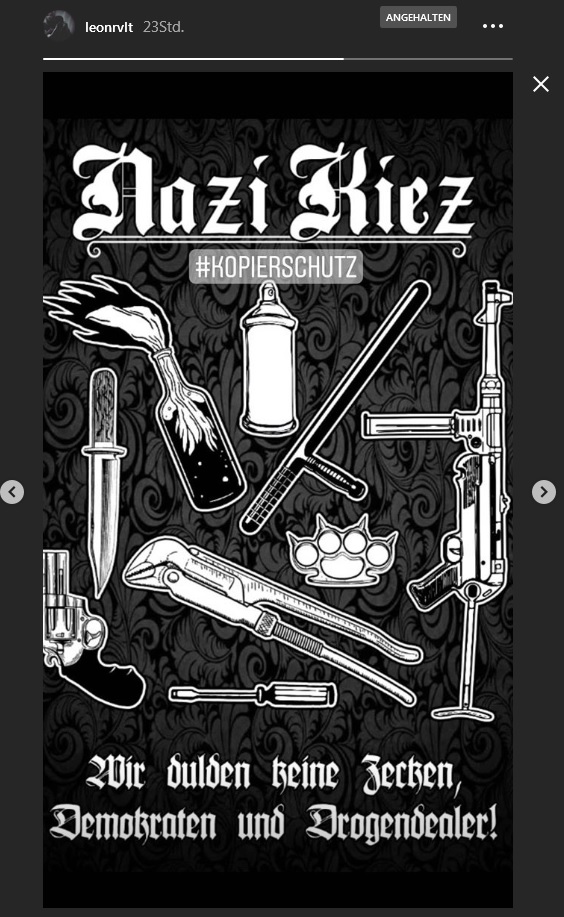 Schon 2018 postete ein Mitglied der Gruppe in den sozialen Netzwerken eine Grafik mit zahlreichen Waffen, unter der es unmissverständlich heißt: „Wir dulden keine Zecken, Demokraten und Drogendealer!“. Gleichzeitig waren immer mehr Bilder online zu finden, die „Kiezstreifen“ zeigen sollten, die Neonazis patrouillierten in „ihrer Stadt“. Und zwischendurch: Immer wieder ideologische Schulungen und Dank an Patrick Wieschke wie im Februar 2019. Hier postete der „Nationale Aufbau“ ein Bild von einem Vortrag in der NPD-Landesgeschäftsstelle mit den Worten: „Vielen Dank an Patrick Wieschke für den heutigen Vortrag“.