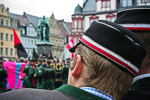 Der „Coburger Convent“ vereinigt „Turner- und Landsmannschaften“ aus Deutschland und Österreich. Sie alle eint eine mehr oder weniger nationalistische, elitäre und sexistische Weltanschauung. Der Pfingstkongress ist für den CC eines der wichtigsten jährlichen Events. Hier werden Entscheidungen für den Verband gefällt und einige fragwürdige Traditionen gepflegt. Am Pfingstmontag wird zum Beispiel den „gefallenen Brüdern“ aus dem 1. und 2. Weltkrieg gedacht, an einem von Adolf Hitler eingeweihten Denkmal, während die CCler „Wichs“ tragen, eine an das Militär aus dem Kaiserreich angelehnte Uniform. Abends geht das Programm weiter mit einem Fackelmarsch, auf dem die uniformierten Männer auf der ehemaligen „Straße der SA“ marschieren.