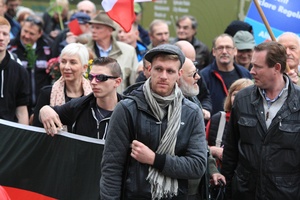 Brandstifter Maik Schneider und Bürgermeisterkandidat Sven Kilian, mit Pierre Dornbrach, Thomas E. und Björn Brusak (v.l.n.r), während eines flüchtlingsfeindlichen Aufzuges 2015 in Nauen.