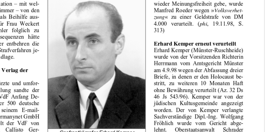Am 21. Juni 1991 wurde das Münsteraner Mitglied der Freiheitlichen Deutschen Arbeiterpartei (FAP) Erhard Kemper vom Landgericht Münster wegen antisemitischer Hetze zu drei Monaten auf Bewährung und 1.500 DM Geldstrafe verurteilt.