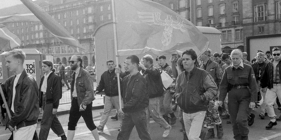 Die Berliner Neonazis Peter Boche (3.v.l) und Sofia Boche (2.v.l.) aus den Kreisen der Berliner Rechtsparteien. Hier beim Aufmarsch der "Nationalen Offensive" am 3. Oktober 1992 in Dresden.