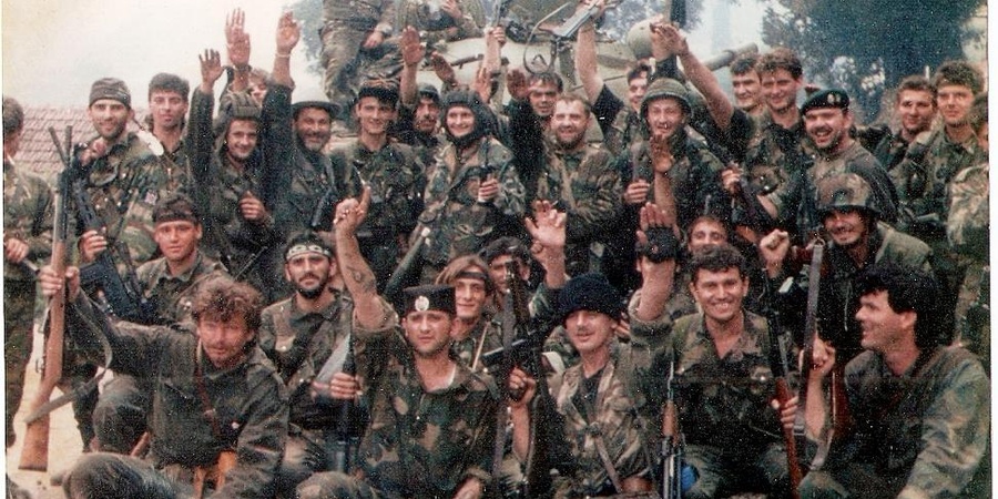 Einige Soldaten der HOS mit "Hitlergruß" nach der Eroberung von Klepci bei Čapljina im Jahr 1992.